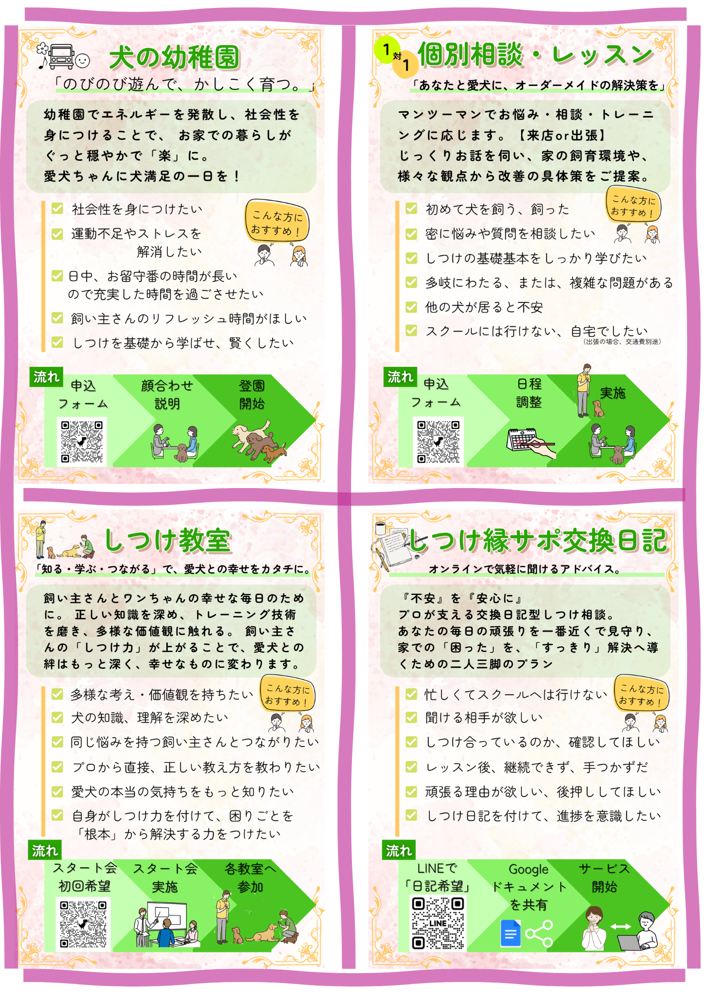 幼稚園や個別レッスンを通じて、人と犬が互いに歩み寄り、 笑顔で暮らせる関係づくりを、親身になってサポートいたします。 ひとりで悩まず、ぜひ私たちにご相談ください。